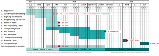 Der «Letter of intent (LOI)» beschreibt die Eckpunkte Ihres geplanten Projekts im Sinn eines Pre-Proposals. Der Inhalt ist nicht bindend. Änderungen im endgültigen "Full Proposal" (siehe weiter unten) sind daher möglich. Die Eingabe von LOI ermöglicht es dem SNF, den Evaluationsprozess zu planen und eine erste, unverbindliche Rückmeldung über die formale Eignung der Gesuchstellenden zu geben. |